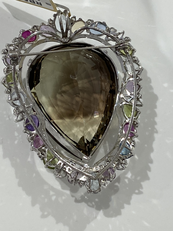 Брошь-кулон с крупным Раух-топазом в огранке груша. Вокруг него расположены хризолиты, топазы, рубины, сапфиры. Вес:34,9грамм. Серебро 925 пробы покрыто белым родием.