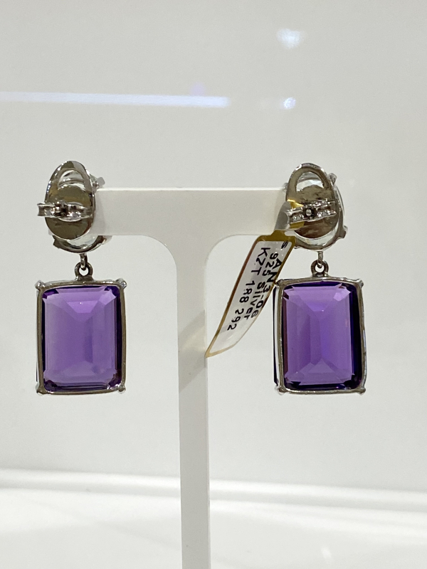Серьги пусеты с овальным зеленым аметистом с подвеской из прямоугольного аметиста. Вес: 19,3 грамм. Серебро 925 пробы покрыто белым родием.